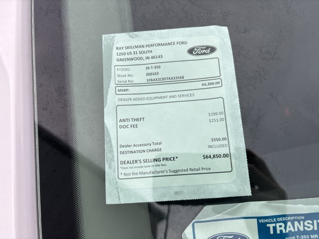 2026 Ford Transit-350 XL Oxford White RWD 10-Speed Automatic with Overdrive 3.5L V6 Flex FuelWHY BUY FROM US? Since first opening our doors, Ray Skillman Ford has been proud to serve Indianapolis, Greenwood and Franklin drivers. Our firm commitment to top-notch customer service has situated us as a leading area Ford dealer, and this is what keeps our customers coming back time and again. We offer a wide selection of vehicles and are excited to help you find a car that's tailored to your specific needs.Call or text 317-885-9800 to schedule your test drive today! All offers shown do not include tax, title, $251 doc/compliance fee, and $299 theft charge .