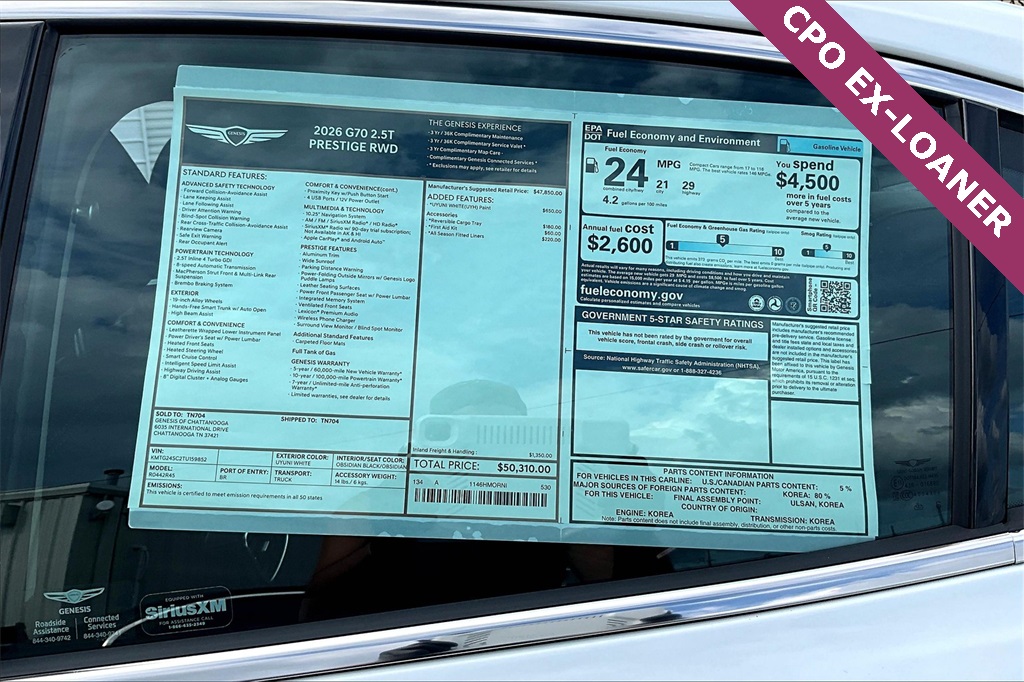 3YR/36 Months Complimentary Maintenance. $2,509 off MSRP!Priced below KBB Fair Purchase Price!2026 Genesis G70 2.5T Prestige Uyuni White Price includes: $1000 - Genesis Retailer Choice: $1000 discount. $43.96 per $1000 financed. Available to well qualified buyers who finance through Genesis Finance. G704. Exp. 03/31/2026