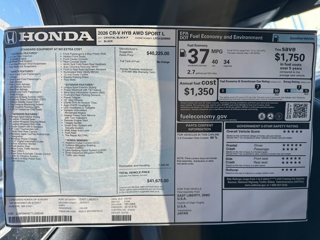 RT 128 Honda is proud to present you with another True Market Priced Vehicle. This 2026 Honda CR-V Hybrid Sport-L is loaded with the following Factory Options: 2.0L I4 DOHC 16V 2.0L I4 DOHC 16V, 4-Wheel Disc Brakes, 8 Speakers, ABS brakes, Adaptive Cruise Control: Adaptive Cruise Control (ACC) with Low-Speed Follow, Air Conditioning, Alloy wheels, Apple CarPlay/Android Auto, Auto High-beam Headlights, Auto-dimming Rear-View mirror, Automatic temperature control, Blind Spot Information (BSI) System warning, Brake assist, Bumpers: body-color, Compass, Delay-off headlights, Driver door bin, Driver vanity mirror, Dual front impact airbags, Dual front side impact airbags, Electronic Stability Control, Exterior Parking Camera Rear, Four wheel independent suspension, Front anti-roll bar, Front Bucket Seats, Front Center Armrest, Front dual zone A/C, Front reading lights, Fully automatic headlights, Heated door mirrors, Heated Front Bucket Seats, Heated front seats, Illuminated entry, Knee airbag, Leather Seat Trim, Leather Shift Knob, Leather steering wheel, Low tire pressure warning, Memory seat, Occupant sensing airbag, Outside temperature display, Overhead airbag, Overhead console, Panic alarm, Passenger door bin, Passenger vanity mirror, Power door mirrors, Power driver seat, Power Liftgate, Power moonroof, Power passenger seat, Power steering, Power windows, Radio data system, Radio: 320-Watt AM/FM Audio System, Rear anti-roll bar, Rear reading lights, Rear seat center armrest, Rear side impact airbag, Rear window defroster, Rear window wiper, Remote keyless entry, Security system, Speed control, Speed-sensing steering, Speed-Sensitive Wipers, Split folding rear seat, Spoiler, Steering wheel mounted audio controls, Telescoping steering wheel, Tilt steering wheel, Traction control, Trip computer, Turn signal indicator mirrors, Variably intermittent wipers, and Wheels: 18 Berlina Black!! Every New Honda comes with our exclusive lifetime powertrain warranty.Route 128 Honda is home to one of Massachusetts largest collection of new Honda models for sale and also boasts a large inventory of used cars for sale as well. Our state of the art facility is designed to make shopping and servicing any new or used cars a breeze. Regardless of your lifestyle, you can be assured that you will get access to the best Honda lease offers and Honda Service professionals in the Boston area. Every inch of our dealership was designed with your satisfaction from the very beginning. Whether you are enjoying the modern comforts of our customer lounge or, browsing our extensive inventory of new and used Honda models for sale. You can be sure that once you visit Route 128 Honda, no other dealership will ever compare.