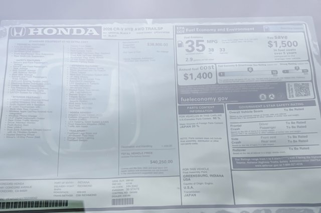 Wireless Phone Connectivity, Wheels: 18 Shark Gray, Vehicle Stability Assist (VSA) Electronic Stability Control (ESC), Valet Function, Trip Computer, Transmission: Electronic Continuously Variable -inc: sport, normal, econ and snow dynamic drive modes, Transmission w/Driver Selectable Mode and Oil Cooler, Traffic Jam Assist, Tires: 235/60R18 107V All-Terrain, Tire mobility kit. This Honda CR-V Hybrid has a dependable Gas/Electric I-4 2.0 L/122 engine powering this Variable transmission.*This Honda CR-V Hybrid TrailSport Has Everything You Want *Tailgate/Rear Door Lock Included w/Power Door Locks, Strut Front Suspension w/Coil Springs, Smart Device Integration, Side Impact Beams, Seats w/Cloth Back Material, Remote Keyless Entry w/Integrated Key Transmitter, Illuminated Entry, Illuminated Ignition Switch and Panic Button, Regenerative 4-Wheel Disc Brakes w/4-Wheel ABS, Front Vented Discs, Brake Assist, Hill Descent Control, Hill Hold Control and Electric Parking Brake, Rear Cupholder, Rear Cross Traffic Monitor (CTM)/Low Speed Braking Control, Rear Child Safety Locks, Radio w/Seek-Scan, Clock, Speed Compensated Volume Control, Steering Wheel Controls, Voice Activation, Radio Data System and External Memory Control, Quasi-Dual Stainless Steel Exhaust w/Chrome Tailpipe Finisher, Proximity Key For Doors And Push Button Start, Power Rear Windows and Fixed 3rd Row Windows, Power Door Locks w/Autolock Feature, Power 1st Row Windows w/Driver And Passenger 1-Touch Up/Down, Permanent Locking Hubs, Perimeter/Approach Lights, Perimeter Alarm, Passenger Seat.* Stop By Today *Live a little- stop by Concord Honda located at 1461 Concord Ave, Concord, CA 94520 to make this car yours today!