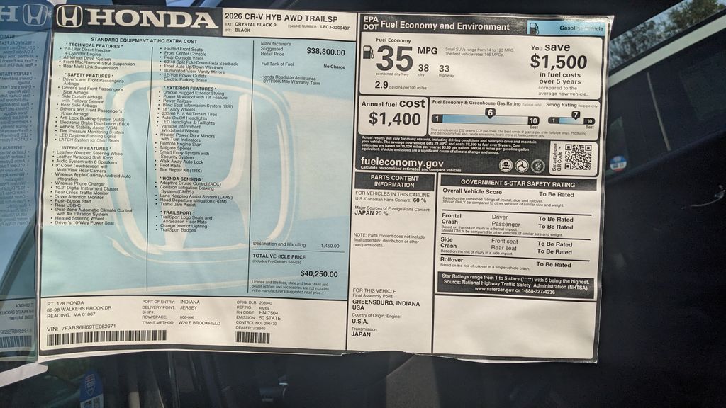 RT 128 Honda is proud to present you with another True Market Priced Vehicle. This 2026 Honda CR-V Hybrid TrailSport is loaded with the following Factory Options: 2.0L I4 DOHC 16V 2.0L I4 DOHC 16V, 4-Wheel Disc Brakes, 8 Speakers, ABS brakes, Adaptive Cruise Control: Adaptive Cruise Control (ACC) with Low-Speed Follow, Air Conditioning, Alloy wheels, Apple CarPlay/Android Auto, Auto High-beam Headlights, Automatic temperature control, Blind Spot Information (BSI) System warning, Brake assist, Bumpers: body-color, Cloth Seat Trim, Compass, Delay-off headlights, Driver door bin, Driver vanity mirror, Dual front impact airbags, Dual front side impact airbags, Electronic Stability Control, Exterior Parking Camera Rear, Four wheel independent suspension, Front anti-roll bar, Front Bucket Seats, Front Center Armrest, Front dual zone A/C, Front reading lights, Fully automatic headlights, Heated door mirrors, Heated Front Bucket Seats, Heated front seats, Heated steering wheel, Illuminated entry, Knee airbag, Leather Shift Knob, Leather steering wheel, Low tire pressure warning, Occupant sensing airbag, Outside temperature display, Overhead airbag, Overhead console, Panic alarm, Passenger door bin, Passenger vanity mirror, Power door mirrors, Power driver seat, Power moonroof, Power steering, Power windows, Radio data system, Radio: 320-Watt AM/FM Audio System, Rear anti-roll bar, Rear reading lights, Rear seat center armrest, Rear side impact airbag, Rear window defroster, Rear window wiper, Remote keyless entry, Security system, Speed control, Speed-sensing steering, Speed-Sensitive Wipers, Split folding rear seat, Spoiler, Steering wheel mounted audio controls, Telescoping steering wheel, Tilt steering wheel, Traction control, Trip computer, Turn signal indicator mirrors, Variably intermittent wipers, and Wheels: 18 Shark Gray!! Every New Honda comes with our exclusive lifetime powertrain warranty.Route 128 Honda is home to one of Massachusetts largest collection of new Honda models for sale and also boasts a large inventory of used cars for sale as well. Our state of the art facility is designed to make shopping and servicing any new or used cars a breeze. Regardless of your lifestyle, you can be assured that you will get access to the best Honda lease offers and Honda Service professionals in the Boston area. Every inch of our dealership was designed with your satisfaction from the very beginning. Whether you are enjoying the modern comforts of our customer lounge or, browsing our extensive inventory of new and used Honda models for sale. You can be sure that once you visit Route 128 Honda, no other dealership will ever compare.