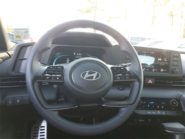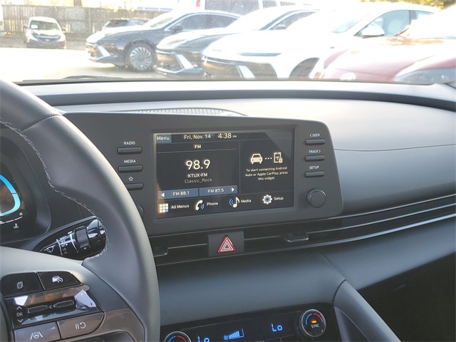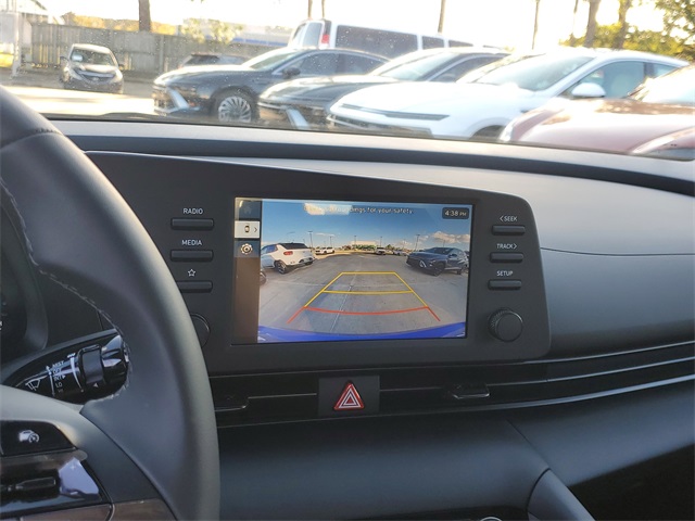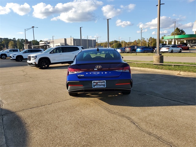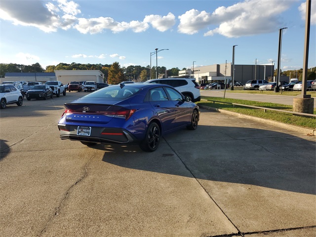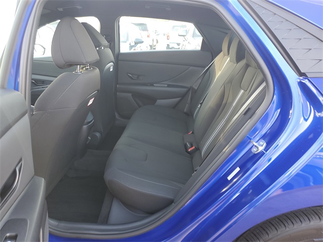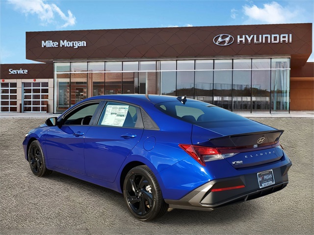 Intense Blue 2026 Hyundai Elantra SEL Sport FWD CVT I430/39 City/Highway MPGOption Group 01, 4-Wheel Disc Brakes, 6 Speakers, ABS brakes, Air Conditioning, Alloy wheels, AM/FM radio, Apple CarPlay & Android Auto, Auto High-beam Headlights, Automatic temperature control, Brake assist, Bumpers: body-color, Delay-off headlights, Driver door bin, Driver vanity mirror, Dual front impact airbags, Dual front side impact airbags, Electronic Stability Control, Exterior Parking Camera Rear, Front anti-roll bar, Front Bucket Seats, Front Center Armrest, Front dual zone A/C, Front reading lights, Front wheel independent suspension, Fully automatic headlights, Illuminated entry, Low tire pressure warning, Occupant sensing airbag, Outside temperature display, Overhead airbag, Overhead console, Panic alarm, Passenger door bin, Passenger vanity mirror, Power door mirrors, Power steering, Power windows, Premium Cloth Seat Trim, Radio: AM/FM/HD Display Audio, Rear side impact airbag, Rear window defroster, Remote keyless entry, Security system, Speed control, Speed-sensing steering, Spoiler, Steering wheel mounted audio controls, Tachometer, Telescoping steering wheel, Tilt steering wheel, Traction control, Trip computer, Variably intermittent wipers, and Wheels: 17 x 7.0J Alloy Gloss Black w/Dark Finish.
