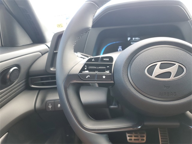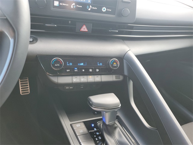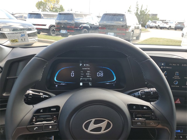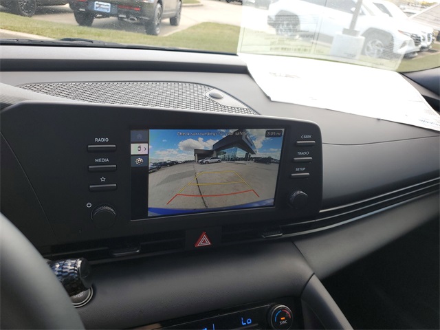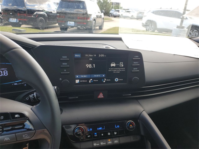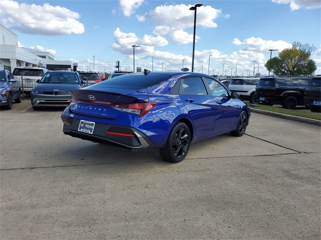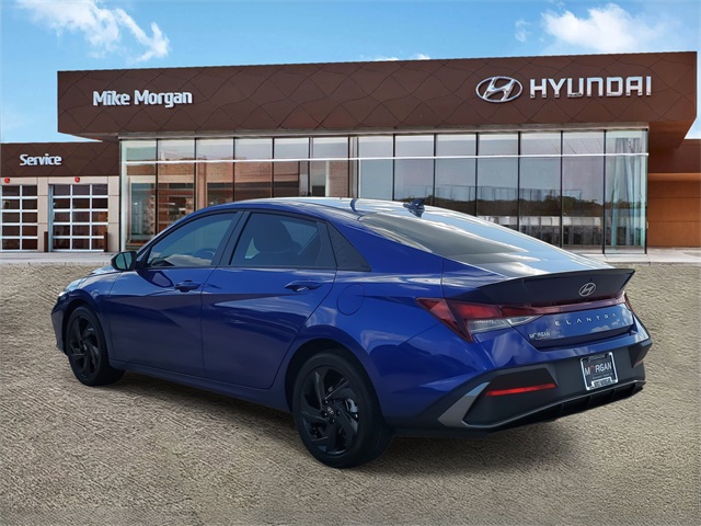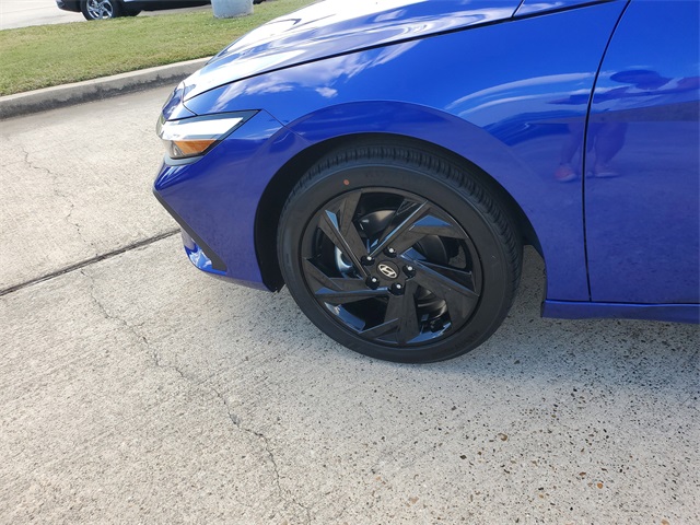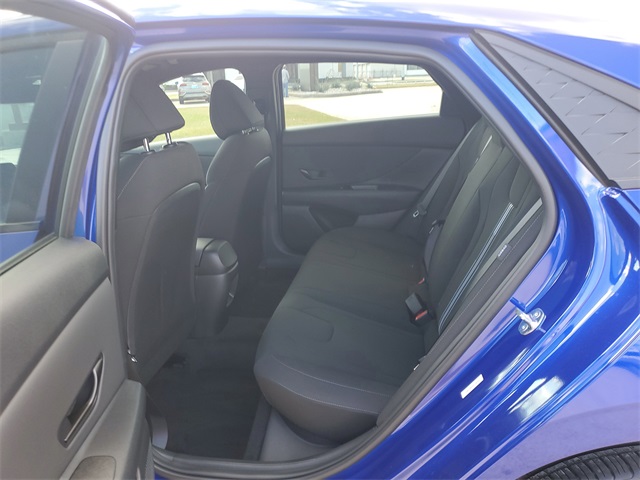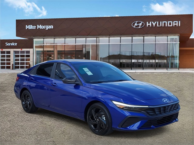 Intense Blue 2026 Hyundai Elantra SEL Sport FWD CVT I430/39 City/Highway MPGOption Group 01, 4-Wheel Disc Brakes, 6 Speakers, ABS brakes, Air Conditioning, Alloy wheels, AM/FM radio, Apple CarPlay & Android Auto, Auto High-beam Headlights, Automatic temperature control, Brake assist, Bumpers: body-color, Delay-off headlights, Driver door bin, Driver vanity mirror, Dual front impact airbags, Dual front side impact airbags, Electronic Stability Control, Exterior Parking Camera Rear, Front anti-roll bar, Front Bucket Seats, Front Center Armrest, Front dual zone A/C, Front reading lights, Front wheel independent suspension, Fully automatic headlights, Illuminated entry, Low tire pressure warning, Occupant sensing airbag, Outside temperature display, Overhead airbag, Overhead console, Panic alarm, Passenger door bin, Passenger vanity mirror, Power door mirrors, Power steering, Power windows, Premium Cloth Seat Trim, Radio: AM/FM/HD Display Audio, Rear side impact airbag, Rear window defroster, Remote keyless entry, Security system, Speed control, Speed-sensing steering, Spoiler, Steering wheel mounted audio controls, Tachometer, Telescoping steering wheel, Tilt steering wheel, Traction control, Trip computer, Variably intermittent wipers, and Wheels: 17 x 7.0J Alloy Gloss Black w/Dark Finish.
