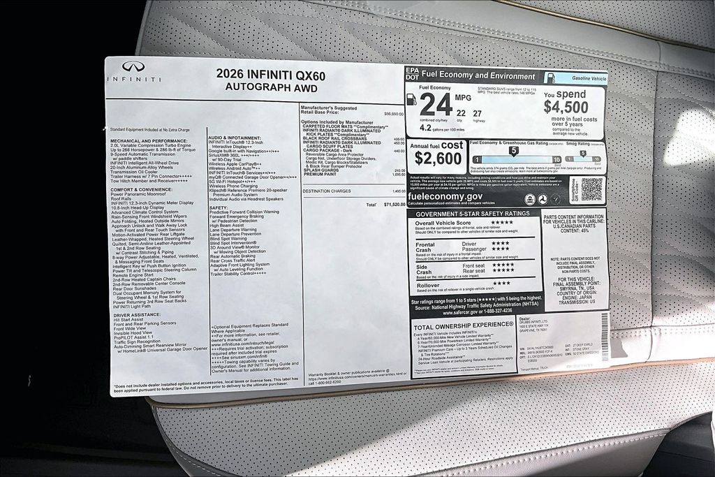 Grubbs INFINITI The Only Authorized INFINITI Dealer in Grapevine Proudly serving drivers across the U.S. Since 1948! Explore one of the largest selections of New and Pre-Owned INFINITI vehicles in the area all backed by our commitment to excellence and exceptional customer service. Every New Grubbs INFINITI comes with: Our Exclusive Lifetime Powertrain Warranty 3 Years of INFINITI-Recommended Maintenance Included, with No Charge Valet Service when servicing your vehicle with pick up and drop at work or home and Hassle-Free Nationwide Shipping is Available. This 2026 INFINITI QX60 Autograph in Deep Emerald/Black Obsidian with Premium Stone Gray interior is equipped with the following high value Features Dark Cargo Package (Black Rear Bumper Film and Cargo Net), 2-Tone Premium Paint, 3rd row seats: bench, 4-Wheel Disc Brakes, ABS brakes, Air Conditioning, Anti-whiplash front head restraints, Apple CarPlay/Android Auto, Auto High-beam Headlights, Auto tilt-away steering wheel, Auto-dimming door mirrors, Auto-dimming Rear-View mirror, Automatic temperature control, Black Roof Rail Crossbars, Brake assist, Bumpers: body-color, Carpeted Floor Mats with Captains Chairs on 3rd Row Tray, Climate Controlled Massaging Front Bucket Seats, Dark Illuminated Kick Plates, Delay-off headlights, Driver door bin, Driver vanity mirror, Dual front impact airbags, Dual front side impact airbags, Electronic Stability Control, Emergency communication system: INFINITI InTouch, Four wheel independent suspension, Front anti-roll bar, Front Bucket Seats, Front Center Armrest, Front dual zone A/C, Front reading lights, Fully automatic headlights, Garage door transmitter: HomeLink, Genuine wood door panel insert, Heads-Up Display, Heated door mirrors, Heated front seats, Heated rear seats, Heated steering wheel, Illuminated entry, INFINITI Radiant Dark Illuminated Cargo Scuff Plates, Knee airbag, Leather Shift Knob, Leather steering wheel, Literature Kit, Low tire pressure warning, Memory seat, Navigation system: Google Built-in, Occupant sensing airbag, Outside temperature display, Overhead airbag, Overhead console, Panic alarm, Passenger vanity mirror, Power door mirrors, Power driver seat, Power Liftgate, Power moonroof: Panoramic, Power passenger seat, Power steering, Power windows, Radio: Klipsch Premiere Audio System, Rain sensing wipers, Rear air conditioning, Rear anti-roll bar, Rear reading lights, Rear side impact airbag, Rear window defroster, Rear window wiper, Reclining 3rd row seat, Remote keyless entry, Security system, Semi Aniline Leather-Appointed Seating Surfaces, Speed control, Speed-sensing steering, Speed-Sensitive Wipers, Splash Guards, Split folding rear seat, Spoiler, Steering wheel memory, Steering wheel mounted audio controls, Tachometer, Telescoping steering wheel, Tilt steering wheel, Traction control, Trip computer, Turn signal indicator mirrors, Variably intermittent wipers, Ventilated front seats, and Wheels: 20 x 8J Luxury Machined Aluminum Alloy.Searching for a refined luxury sedan, a powerful performance SUV, or a sophisticated crossover? New INFINITI vehicles deliver bold design, advanced technology, and exhilarating performance backed by legendary craftsmanship. Discover why buyers nationwide trust Grubbs INFINITI of Grapevine, a family-owned dealership proudly serving customers since 1948. We offer nationwide vehicle shipping with licensed, bonded, and fully insured carriers, along with competitive financing through top banks and credit unions for all credit types. When you choose a New or Certified INFINITI, youll enjoy a first-class buying experience guided by our factory-trained INFINITI specialists from start to finish. Proudly serving Grapevine, Dallas, Frisco, Lewisville, Trophy Club, Flower Mound, Northlake, Fort Worth, Plano, Southlake, Arlington, Denton, Austin, and the entire DFW area. Call 817-753-8387 or visit www.grubbsinfiniti. Price includes: $6000 - Retail Cash. Exp. 03/02/2026