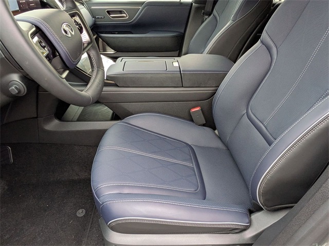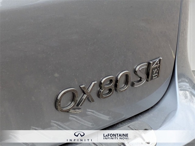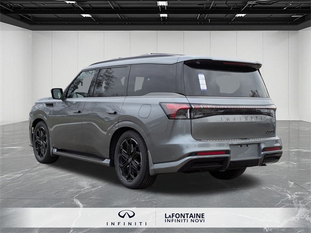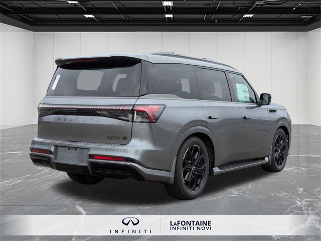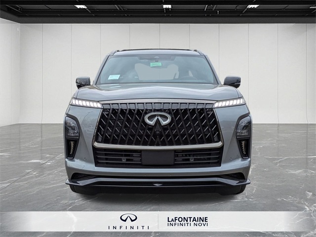Gray 2026 INFINITI QX80 SPORT 4WD 9-Speed Automatic 3.5L V6 DOHC 24V3rd row seats: bench, Adaptive suspension, Apple CarPlay/Android Auto, Black Interior Lighting Package, Black Roof Rail Crossbars, Dark Chrome Rear Bumper Protector, Heads-Up Display, Heated front seats, Heated rear seats, INFINITI Radiant Black Cargo Scuff Plates, Navigation system: Google Built-in, Panoramic Illuminated Headliner, Power Liftgate, Power moonroof, Rain sensing wipers, Sport Exterior Package, Unique SPORT Semi-Aniline Leather Seating Surfaces, Ventilated front seats, Ventilated rear seats, Wheels: 22 x 8.5J Unique SPORT Alloy.Check out this attractive 2026 INFINITI QX80 with the following amenities Black Interior Lighting Package (INFINITI Radiant Black Cargo Scuff Plates and Panoramic Illuminated Headliner), Sport Exterior Package (Black Roof Rail Crossbars and Dark Chrome Rear Bumper Protector), 3rd row seats: bench, Adaptive suspension, Apple CarPlay/Android Auto, Heads-Up Display, Heated front seats, Heated rear seats, Navigation system: Google Built-in, Power Liftgate, Power moonroof, Rain sensing wipers, Unique SPORT Semi-Aniline Leather Seating Surfaces, Ventilated front seats, Ventilated rear seats, Wheels: 22 x 8.5J Unique SPORT Alloy, 4-Wheel Disc Brakes, ABS brakes, Air Conditioning, Alloy wheels, AM/FM radio: SiriusXM with 360L, Anti-whiplash front head restraints, Audio memory, Auto High-beam Headlights, Auto tilt-away steering wheel, Auto-dimming door mirrors, Auto-dimming Rear-View mirror, Auto-leveling suspension, Automatic temperature control, Brake assist, Compass, Delay-off headlights, Driver door bin, Driver vanity mirror, Dual front impact airbags, Dual front side impact airbags, Electronic Stability Control, Emergency communication system: INFINITI InTouch, Four wheel independent suspension, Front anti-roll bar, Front Bucket Seats, Front Center Armrest, Front dual zone A/C, Front reading lights, Fully automatic headlights, Garage door transmitter: HomeLink, Genuine wood dashboard insert, Genuine wood door panel insert, Heated door mirrors, Heated steering wheel, HVAC memory, Illuminated entry, Knee airbag, Leather steering wheel, Low tire pressure warning, Memory seat, Occupant sensing airbag, Outside temperature display, Overhead airbag, Overhead console, Panic alarm, Passenger door bin, Passenger vanity mirror, Power door mirrors, Power driver seat, Power passenger seat, Power steering, Power windows, Radio data system, Rear air conditioning, Rear anti-roll bar, Rear reading lights, Rear seat center armrest, Rear window defroster, Rear window wiper, Reclining 3rd row seat, Remote keyless entry, Security system, Speed control, Speed-sensing steering, Splash Guards, Split folding rear seat, Spoiler, Steering wheel memory, Steering wheel mounted audio controls, Tachometer, Telescoping steering wheel, Tilt steering wheel, Traction control, Trip computer, Turn signal indicator mirrors, and Variably intermittent wipers.