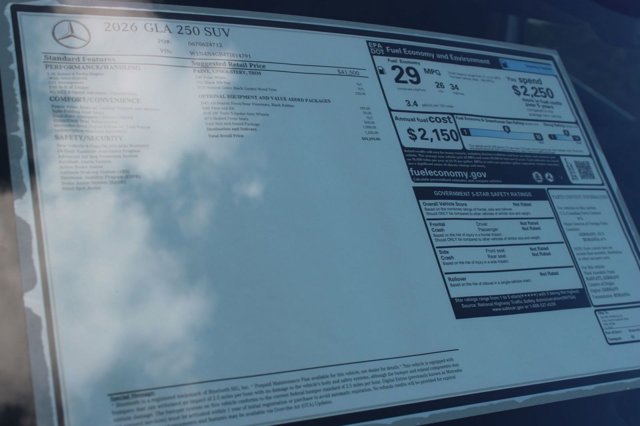 This 2026 Mercedes-Benz GLA 250 featuring SUN & SOUND PACKAGE, Blind Spot Monitor, Front Collision Mitigation, Back-Up Camera, Panoramic Sliding Sunroof, Power Folding Mirrors, Power Liftgate, Bluetooth Connection, Smart Device Integration, Auxiliary Audio Input, Remote Trunk Release, Multi-Zone A/C, Rain Sensing Wipers, Integrated Turn Signal Mirrors, Wood Trim, and much more! This is a Clean Carfax vehicle. The Sonic Automotive difference: Each vehicle completed a safety & reconditioning process by one of our Mercedes-Benz Certified technicians including a full inspection, road test and updating of recommended services. Our Sonic pricing makes buying a Pre-Owned Vehicle easy and convenient by giving you the markets best price right up-front, eliminating the hassles of negotiations. Our professional team will be delighted to answer any questions you may have. Please chat, e-mail or call us today to schedule your test drive and experience the difference for yourself at Mercedes-Benz of Fort Myers.