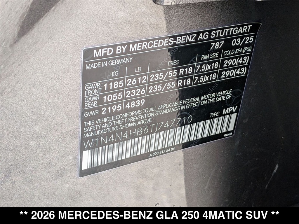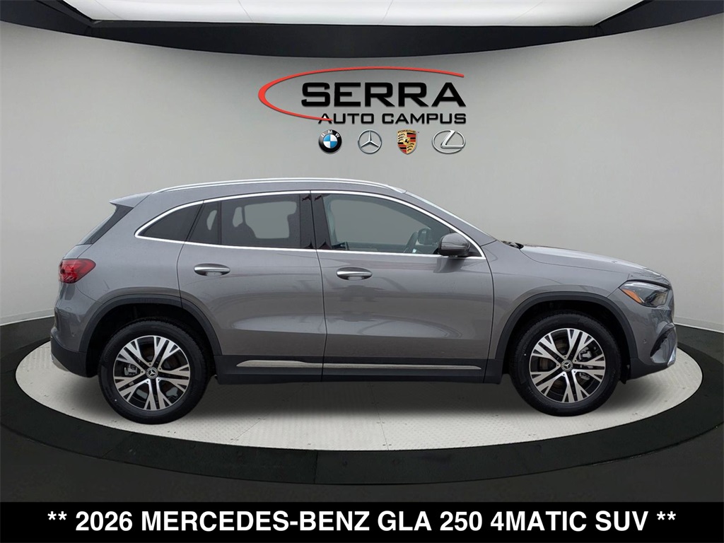 Apple CarPlay/Android Auto, Exclusive Trim Package, Heated Seats, Power Liftgate, Wheels: 18 Twin 5-Spoke. Mountain Gray Metallic 2026 Mercedes-Benz GLA 4D Sport Utility GLA 250 2.0L I4 Turbocharged 8 Speed Dual Clutch 4MATIC 25/33 City/Highway MPGWelcome to the Serra Auto Campus, whether you are looking for a new or pre-owned BMW, Mercedes-Benz or Porsche car, or SUV you will find it here. We have helped many customers from Alma, Ann Arbor, Charlotte, East Lansing, Eaton Rapids, Flint, Grand Blanc, Fenton, Holt, Howell, Jackson, Lansing, Mason, Okemos, Owosso, Mt. Pleasant, Saginaw, Midland, Jackson and Kalamazoo find the BMW, Mercedes-Benz or Porsche of their dreams!