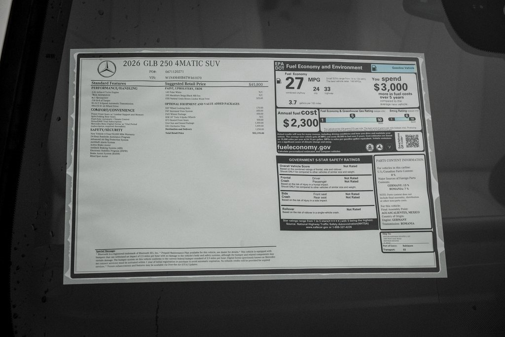 Polar White 2026 Mercedes-Benz GLB GLB 250 4MATIC 4MATIC 8 Speed Dual Clutch 2.0L I4 Turbocharged Advanced Sound System, Exclusive Line Package, Heated Front Seats, Heated Steering Wheel, Heated Washer System, Music Streaming, Panorama Roof, Parking Package w/ Surround View Camera, Sun & Sound Package, Wheel Locking Bolts, Wheels: 18 Twin 5-Spoke AERO, Winter Package.<br><br>Recent Arrival! 24/33 City/Highway MPG<br><br><br>Burmester is a registered trademark of Burmester Audio System GmbH, Berlin, Germany.