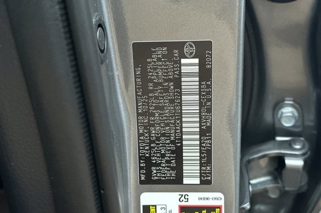 Certified. Heavy Metal 2026 Toyota Camry SE FWD eCVT 2.5L 4-Cylinder 16V DOHC Black w/SofTex and Fabric Seat Trim.Recent Arrival! 48/47 City/Highway MPGToyota Details:* Powertrain Limited Warranty: 84 Month/100,000 Mile (whichever comes first) from TCUV purchase date* Transferable Warranty* 160 Point Inspection* Limited Warranty: 12 Month/12,000 Mile Limited Comprehensive Warranty: 12 Month/12,000 Mile (whichever comes first) from certified purchase date* Warranty Deductible: $0* HV Battery Warranty coverage for 10 years/150,000 miles. (2020 model year forward Hybrid-Related) 8 years/100,000 miles, whichever comes first, from original date of first use when sold as new. Fuel Cell Vehicle Warranty 8 years/100,000 mile (whichever comes first) on key fuel cell components. Roadside Assistance for 7 Year / 100,000 Mile* Roadside Assistance* Vehicle History