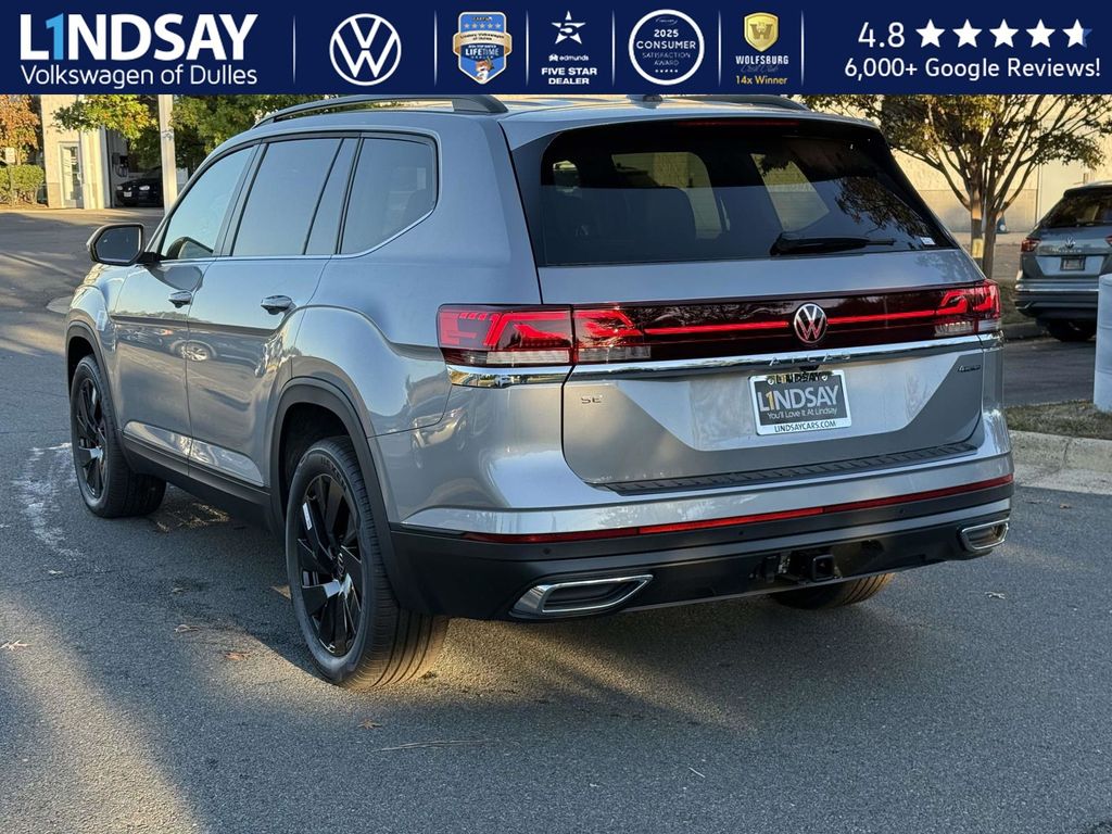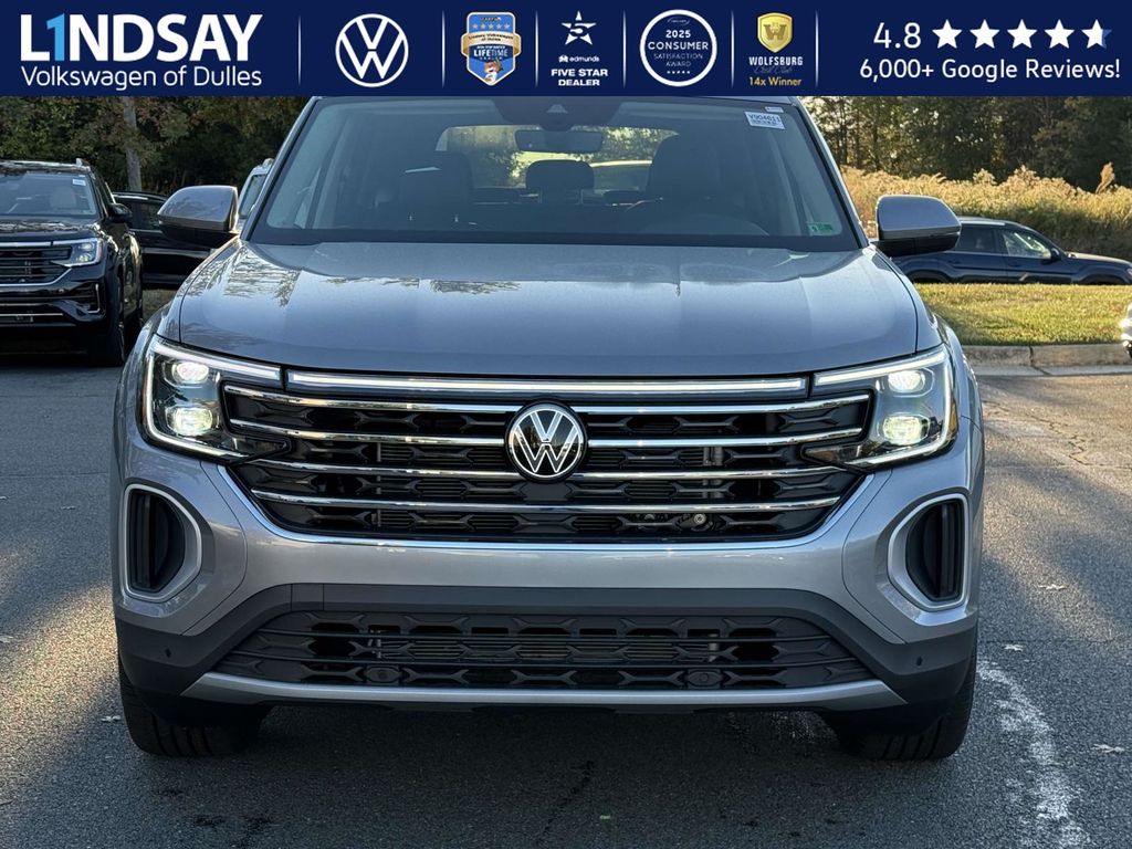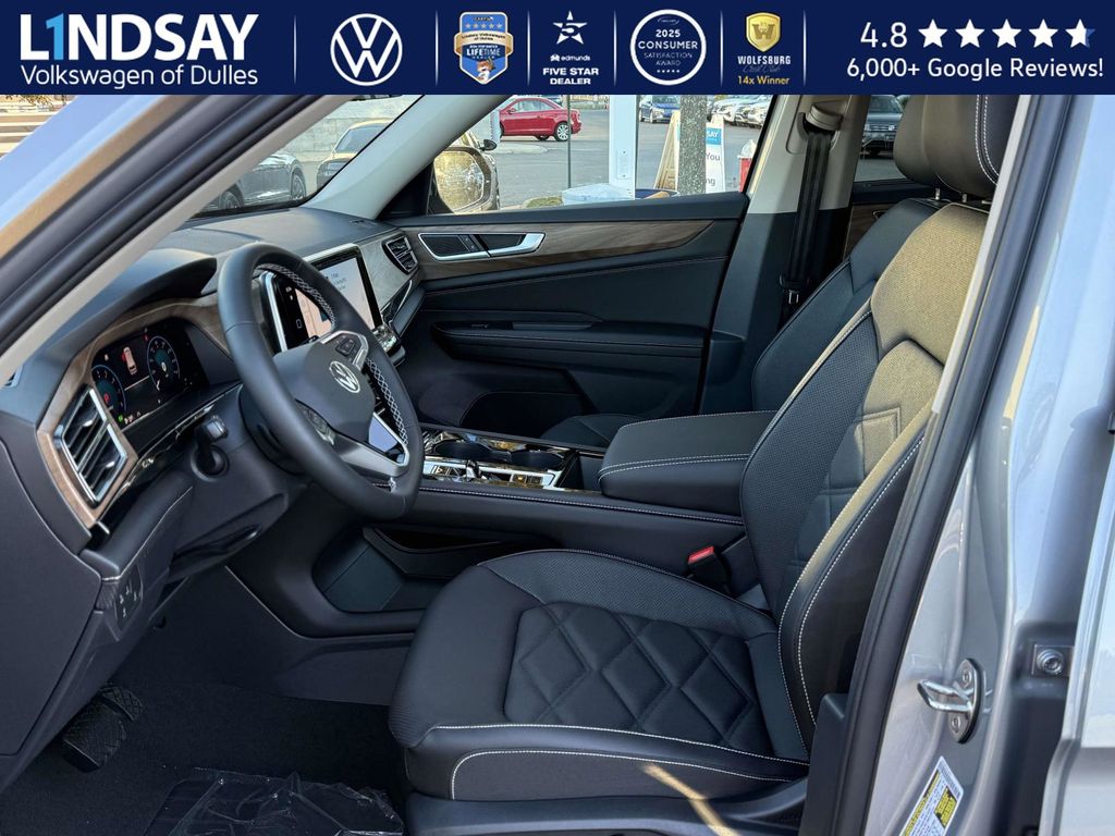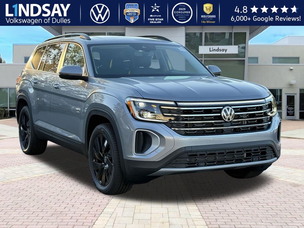 silver mist metallic 2026 Volkswagen Atlas SE w/Technology AWD 8-Speed Automatic with Tiptronic 2.0L TSI VOLKSWAGEN DIGITAL COCKPIT INSTRUMENT DISPLAY!, IQ.DRIVE PACKAGE - TRAVEL ASSIST (SEMI-AUTOMATED DRIVING ASSISTANCE), ADAPTIVE CRUISE CONTROL, LANE ASSIST, EMERGENCY ASSIST, FORWARD COLLISION WARNING & AUTONOMOUS EMERGENCY BRAKING, BLIND SPOT MONITOR W/ REAR TRAFFIC ALERT!, 3rd row seats: split-bench, Active Cruise Control, AM/FM radio: SiriusXM with 360L, Auto High-beam Headlights, Auto-dimming Rear-View mirror, Automatic temperature control, Black Bumperdillo Rear Bumper Protection Plate, Black Wheel Package, Electronic Stability Control, Exterior Parking Camera Rear, Four wheel independent suspension, Front dual zone A/C, Front fog lights, Fully automatic headlights, Heated & Actively Ventilated Front Bucket Seats, Heated door mirrors, Heated steering wheel, Illuminated entry, Panoramic Sunroof Package, Perforated V-Tex Leatherette Seating Surfaces, Power driver seat, Power Liftgate, Power Tilting & Sliding Panoramic Sunroof, Radio: MIB3 Composition Media, Rain sensing wipers, Rear air conditioning, Remote keyless entry, Split folding rear seat, Steering wheel mounted audio controls, Traction control, Turn signal indicator mirrors, Variably intermittent wipers, Volkswagen Logo Puddle Lights, Wheels: 20 Multi-Spoke Black Painted Alloy. 19/26 City/Highway MPG